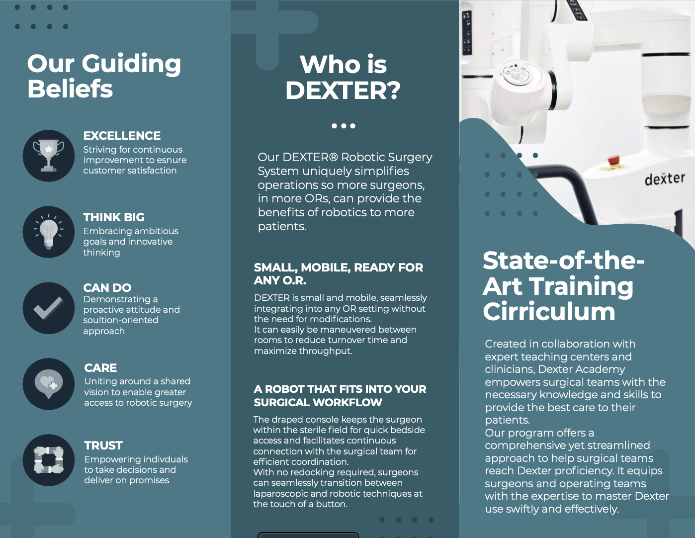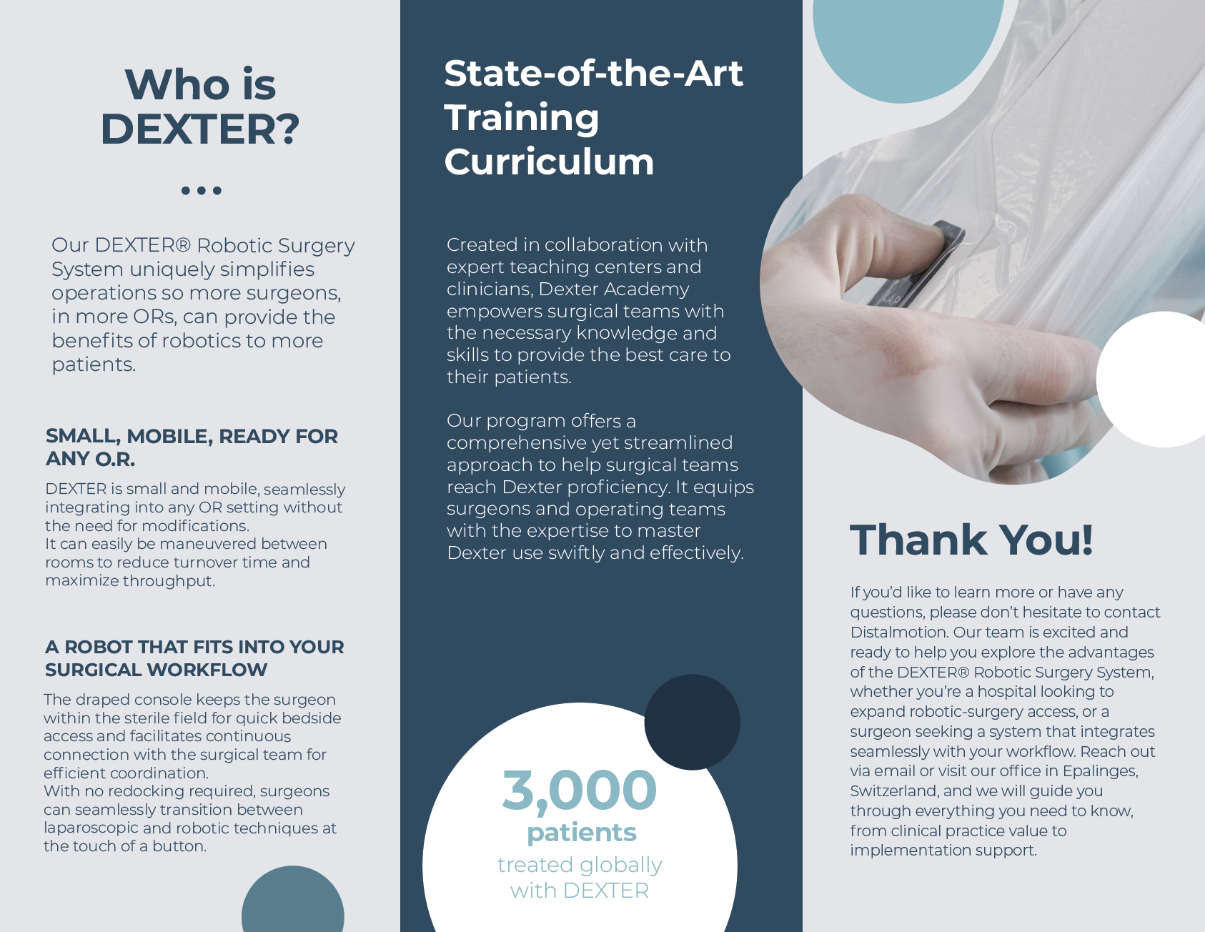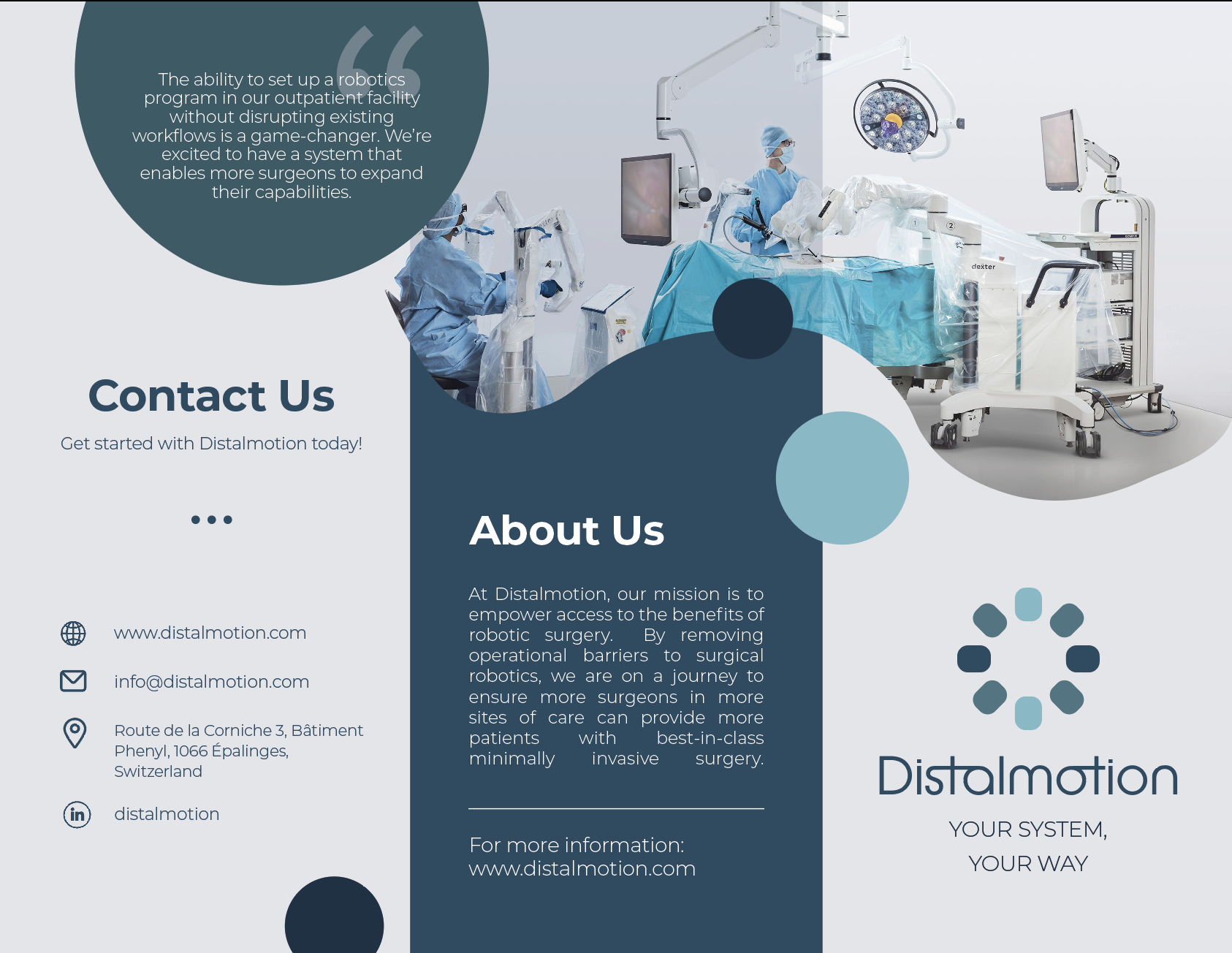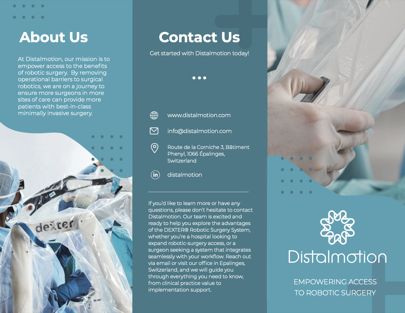 The brochure was one of our marketing tactics to reaching new ASCs (Ambulatory Surgery Centers). We wanted to give people a “takeaway item” that would keep the brand Distalmotion in their mind. The first version of the brochure, in the cyan-teal tones, features information about Distalmotion as a company, their robot, training curriculum, and contact information. The second version, the gray and blue brochure, is similar. I swapped out the ‘Guiding Beliefs’ for a ‘Thank You' portion, showing the customers appreciation for their interest in Distalmotion’s company, products, and services. I also added some statistics and quotations from their website to create more visual interest and show the success of the company and their product, DEXTER.